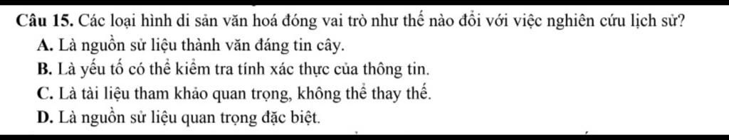 Câu 15. Các loại hình di sản văn hoá đóng vai trò như thế nào đổi với việc nghiên cứu lịch sử?