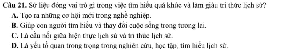 `->` Sử liệu đóng vai trò quan trọng trong việc kết nối những sự kiện, hiện tượng lịch sử với những hiểu biết và tri thức mà con người có được về quá khứ. Chúng giúp tái hiện và phân tích lịch sử một cách chính xác và có hệ thống.