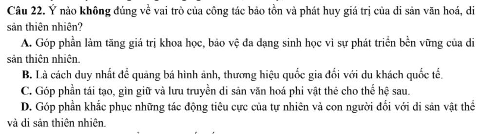 `-` Lí do : Vai trò của công tác bảo tồn và phát huy giá trị của di sản văn hoá, di sản thiên nhiên không phải là cách duy nhất để quảng bá hình ảnh, thương hiệu quốc gia đối với du khách quốc tế. Vai trò của công tác bảo tồn và phát huy giá trị của di sản văn hoá, di sản thiên nhiên là làm góp phần làm tăng giá trị khoa học, bảo vệ đa dạng sinh học vì sự phát triển bền vững của di sản thiên nhiên, góp phần tái tạo, gìn giữ và lưu truyền di sản văn hoá phi vật thể, góp phần khắc phục những tác động tiêu cực của tự nhiên và con người đối với di sản vật thể và di sản thiên nhiên.