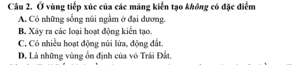 Câu `\bb2.` Ở vùng tiếp xúc của các mảng kiến tạo không có đặc điểm