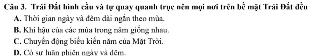 Câu `\bb3.` Trái Đất hình cầu và tự quay quanh trục nên mọi nơi trên bề mặt Trái Đất đều