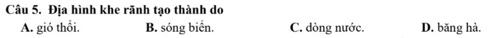 Câu `\bb5.` Địa hình khe rãnh tạo thành do