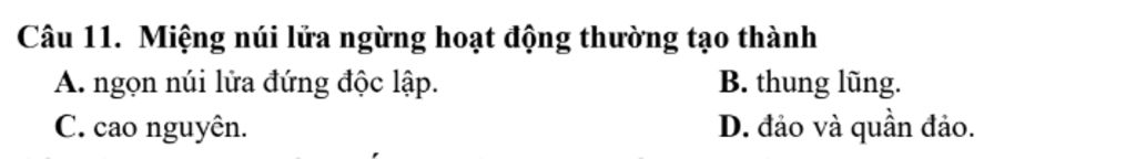 Câu `11`: Miệng núi lửa ngừng hoạt động thường tạo thành