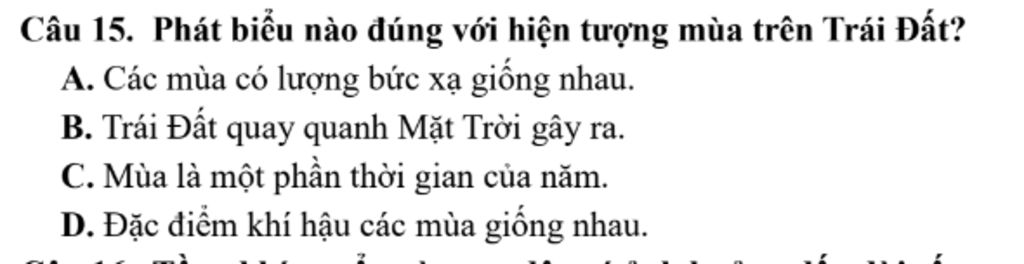 Câu 15. Phát biểu nào đúng với hiện tượng mùa trên Trái Đất?