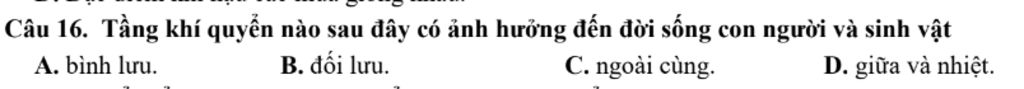 Câu 16. Tầng khí quyển nào sau đây có ảnh hưởng đến đời sống con người và sinh vật