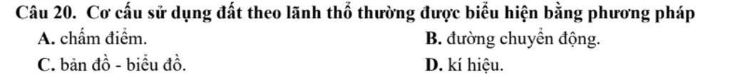 Câu `20` Cơ cấu sử dụng đất theo lãnh thổ thường được biểu hiện bằng phương pháp