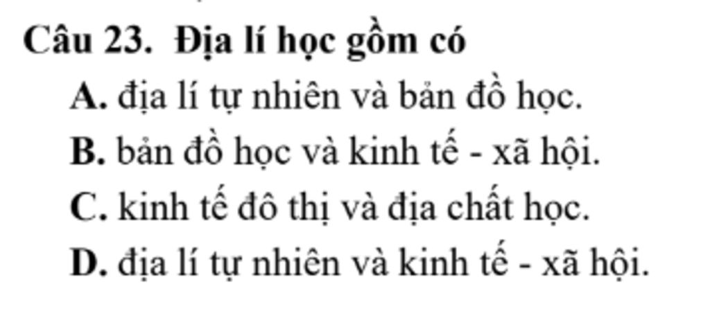 → Địa lí học gồm địa lí tự nhiên (nghiên cứu các yếu tố tự nhiên như khí hậu, địa hình) và địa lí kinh tế - xã hội (nghiên cứu sự phân bố và hoạt động của con người, kinh tế, xã hội).
