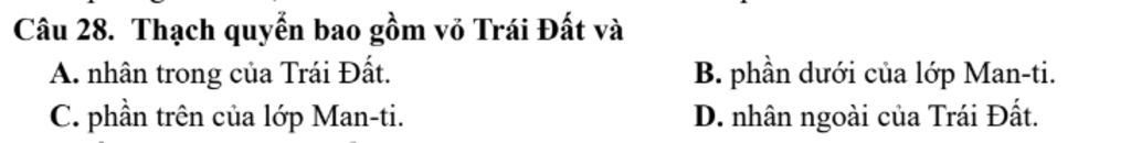 Câu `\bb28.` Thạch quyển bao gồm vỏ Trái Đất và