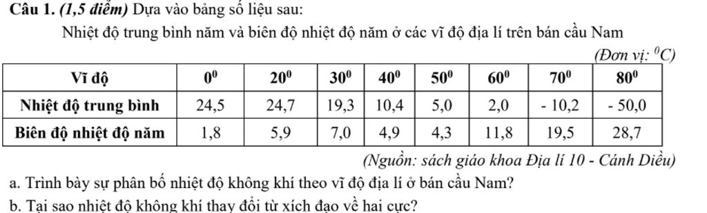 Câu 1. (1,5 điểm) Dựa vào bảng số liệu sau: