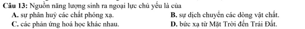 Câu `\bb13:` Nguồn năng lượng sinh ra ngoại lực chủ yếu là của