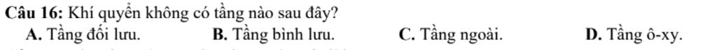Câu `16`: Khí quyển không có ở tầng nào sau đây?