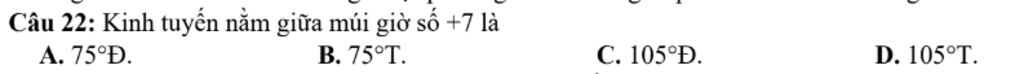 Câu `22`: Kinh tuyến nằm giữa múi giờ +`7` là
