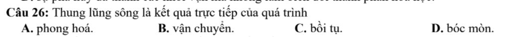 Câu 26: Thung lũng sông là kết quả trực tiếp của quá trình