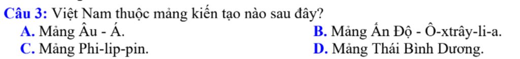 Câu `\bb3:` Việt Nam thuộc mảng kiến tạo nào sau đây?