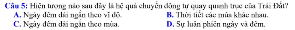 Câu 5: Hiện tượng nào sau đây là hệ quả chuyển động tự quay quanh trục của Trái Đất?