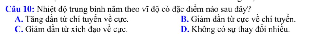 Câu `10`: Nhiệt độ trung bình năm theo vĩ độ có đặc điểm nào sau đây?