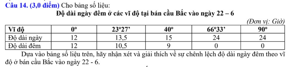 Dựa vào bảng số liệu trên, hãy nhận xét và giải thích về sự chênh lệch độ dài ngày đêm theo vĩ độ ở bán cầu Bắc vào ngày 22 - 6.