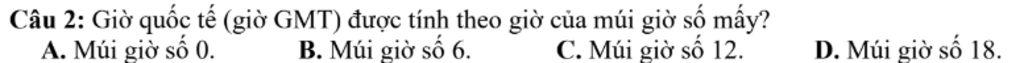 Câu `2:` Giờ quốc tế `(` giờ `GMT` `)` được tính theo giờ của múi giờ số mấy?