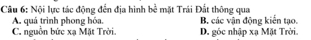 Câu 6: Nội lực tác động đến địa hình bề mặt Trái Đất thông qua