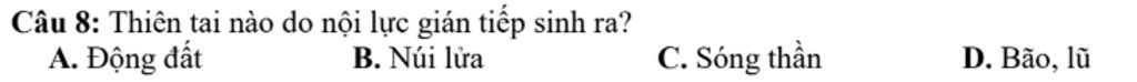Câu 8: Thiên tai nào do nội lực gián tiếp sinh ra?