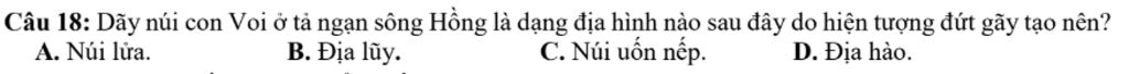 Câu 18: Dãy núi con Voi ở tả ngạn sông Hồng là dạng địa hình nào sau đây do hiện tượng đứt gãy tạo nên?