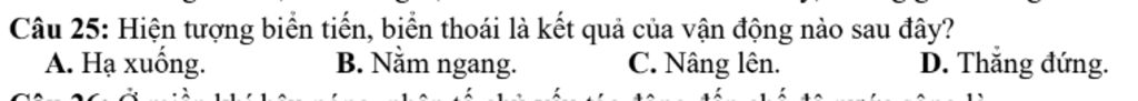 Câu `25:` Hiện tượng biển tiến, biển thoái là kết quả của vận động nào sau đây?