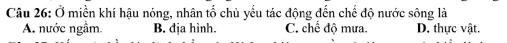 Câu `26:` Ở miền khí hậu nóng, nhân tố chủ yếu tác động đến chế độ nước sông là