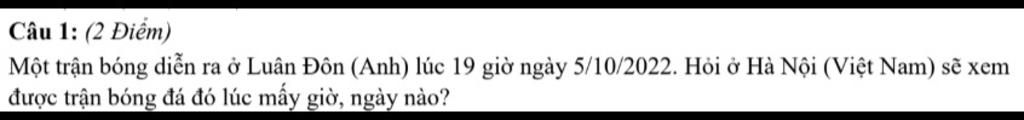 Khi Luân Đôn `(` Anh `)` là `19` giờ ngày $5/10/2022$ thì Hà Nội `(` Việt Nam `)` có thời gian là`:`