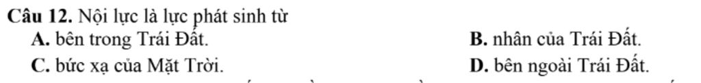 `-` Nội lực là các lực phát sinh từ bên trong Trái Đất, được sinh ra chủ yếu từ năng lượng của sự phân huỷ các chất phóng xạ, sự dịch chuyển của các động vật chất theo quy luật của trọng lực, năng lượng của các phản ứng hoá học,...