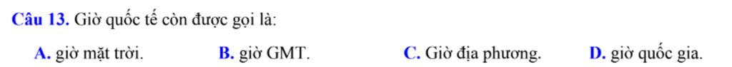 Câu 13. Giờ quốc tế còn được gọi là:
