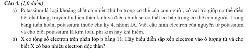 a) Potassium là loại khoáng chất có nhiều thứ ba trong cơ thể của con người, có vai trò giúp cơ thể điều tiết chất lỏng, truyền tín hiệu thần kinh và điều chỉnh sự co thắt cơ bắp trong cơ thể con người. Trong bảng tuần hoàn, potassium thuộc chu kỳ 4, nhóm IA. Viết cấu hình electron của nguyên tử potassium và cho biết potassium là kim loại, phi kim hay khí hiếm.