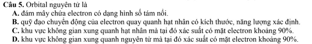 Orbital nguyên tử là khu vực không gian xung quanh hạt nhân mà tại đó xác suất có mặt electron khoảng `90%`