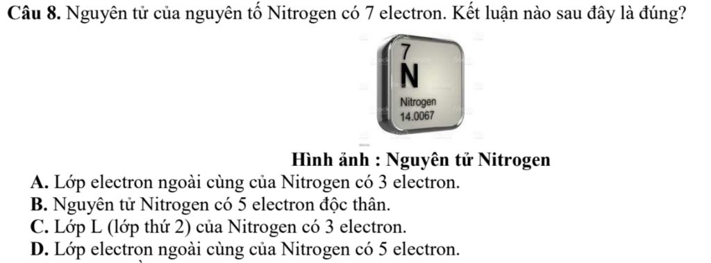 Câu 8. Nguyên tử của nguyên tố Nitrogen có 7 electron. Kết luận nào sau đây là đúng?