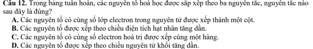 Câu 12. Trong bảng tuần hoàn, các nguyên tố hoá học được sắp xếp theo ba nguyên tắc, nguyên tắc nào sau đây là đúng?