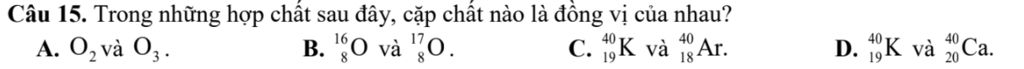 Câu 15. Trong những hợp chất sau đây, cặp chất nào là đồng vị của nhau?