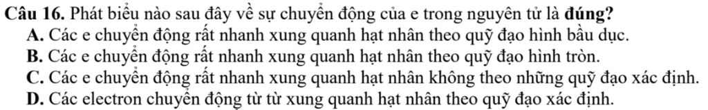 Câu 16. Phát biểu nào sau đây về sự chuyển động của e trong nguyên tử là đúng?