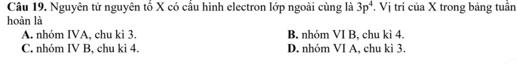 Câu 19. Nguyên tử nguyên tố X có cấu hình electron lớp ngoài cùng là `3p^4.` Vị trí của X trong bảng tuần hoàn là