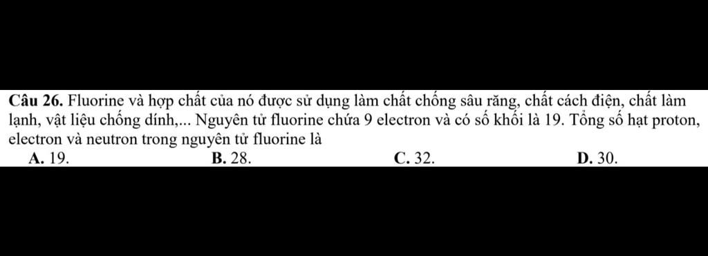 Câu 26. Fluorine và hợp chất của nó được sử dụng làm chất chống sâu răng, chất cách điện, chất làm lạnh, vật liệu chống dính,... Nguyên tử fluorine chứa 9 electron và có số khối là 19. Tổng số hạt proton, electron và neutron trong nguyên tử fluorine là