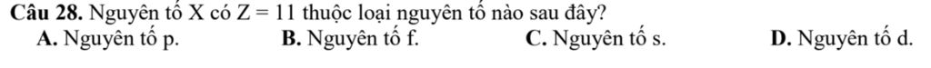 Câu 28. Nguyên tố X có Z = 11 thuộc loại nguyên tố nào sau đây?