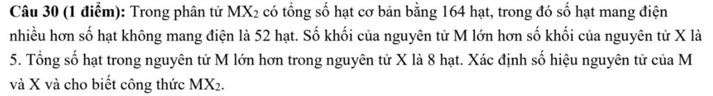 Câu 30 (1 điểm): Trong phân tử `MX_2` có tổng số hạt cơ bản bằng 164 hạt, trong đó số hạt mang điện nhiều hơn số hạt không mang điện là 52 hạt. Số khối của nguyên tử M lớn hơn số khối của nguyên tử X là 5. Tổng số hạt trong nguyên tử M lớn hơn trong nguyên tử X là 8 hạt.