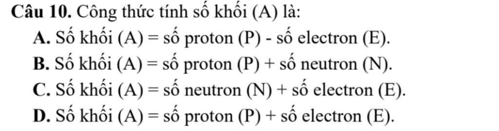 Số khối = Số proton + Số electron, hay `A=Z+N`.