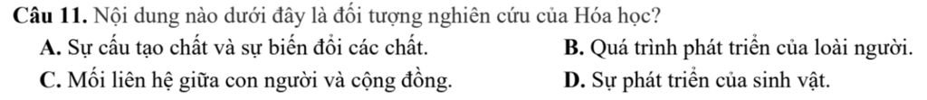 Câu 11. Nội dung nào dưới đây là đối tượng nghiên cứu của Hóa học?