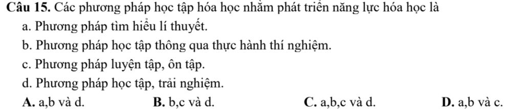 Câu 15. Các phương pháp học tập hóa học nhằm phát triển năng lực hóa học là