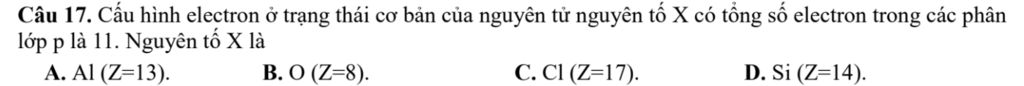 Câu 17. Cấu hình electron ở trạng thái cơ bản của nguyên tử nguyên tố X có tổng số electron trong các phân lớp p là 11. Nguyên tố X là