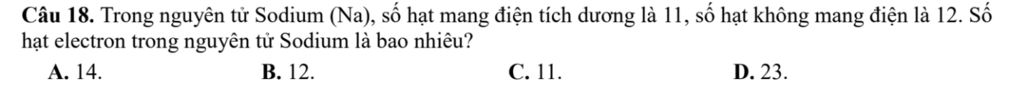 Câu 18. Trong nguyên tử Sodium (Na), số hạt mang điện tích dương là 11, số hạt không mang điện là 12. Số hạt electron trong nguyên tử Sodium là bao nhiêu?