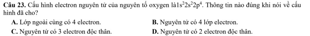 Câu 23. Cấu hình electron nguyên tử của nguyên tố oxygen là `1s^2 2s^2 2p^3`. Thông tin nào đúng khi nói về cấu hình đã cho?