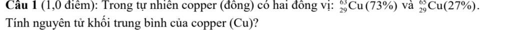 Câu 1 (1,0 điểm): Trong tự nhiên copper (đồng) có hai đồng vị: $^{63}_{29}\text{Cu}$ (73%) và $^{65}_{29}\text{Cu}$(27%).