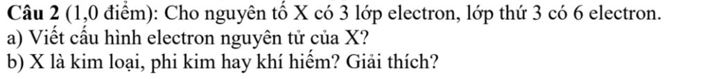Câu 2 (1,0 điểm): Cho nguyên tố X có 3 lớp electron,lớp thứ 3 có 6 electron.
