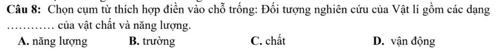 Câu 8: Chọn cụm từ thích hợp điền vào chỗ trống: Đối tượng nghiên cứu của Vật lí gồm các dạng......... của vật chất và năng lượng.