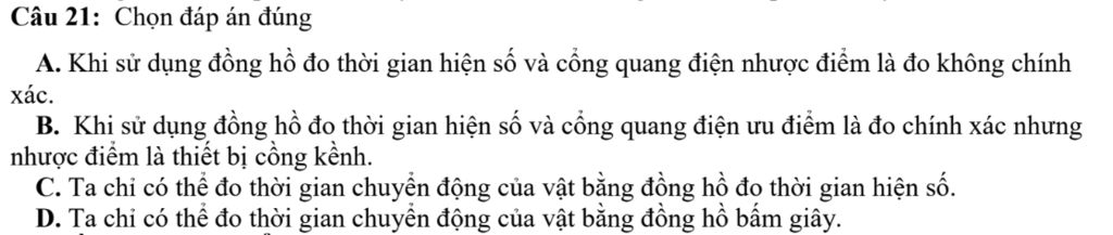 Khi sử dụng đồng hồ đo thời gian hiện số và cổng quang điện ưu điểm là đo chính xác nhưng nhược điểm là thiết bị cồng kềnh